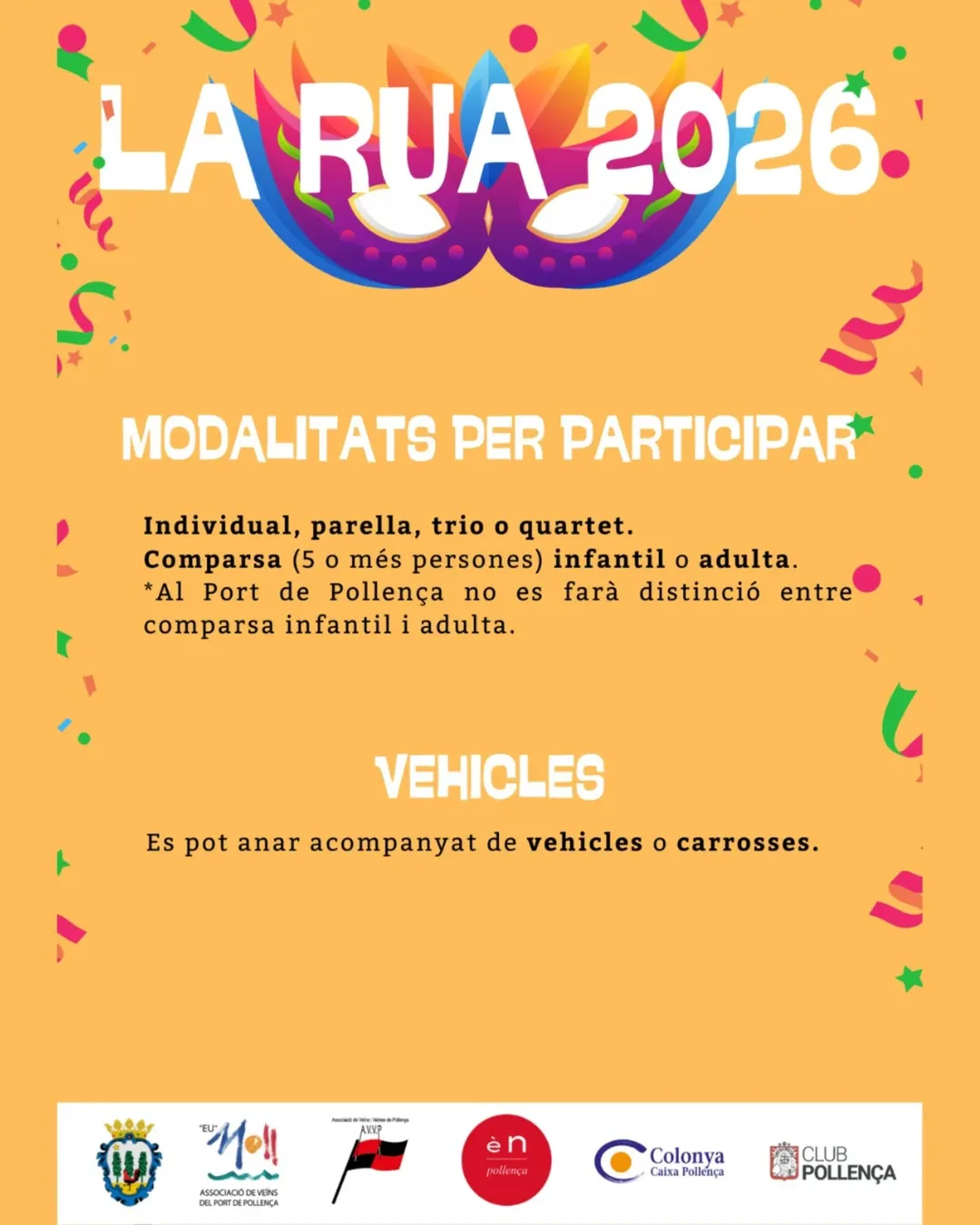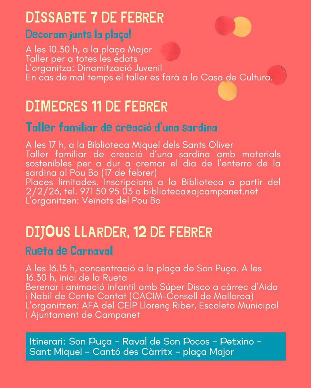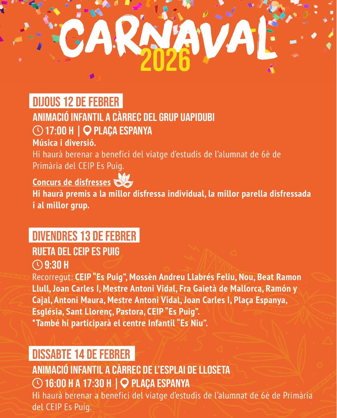 • Sun 8 Feb · concentration 15:30 · parade 16:00 · children’s entertainment + prizes (Plaça de ses Escoles Velles)