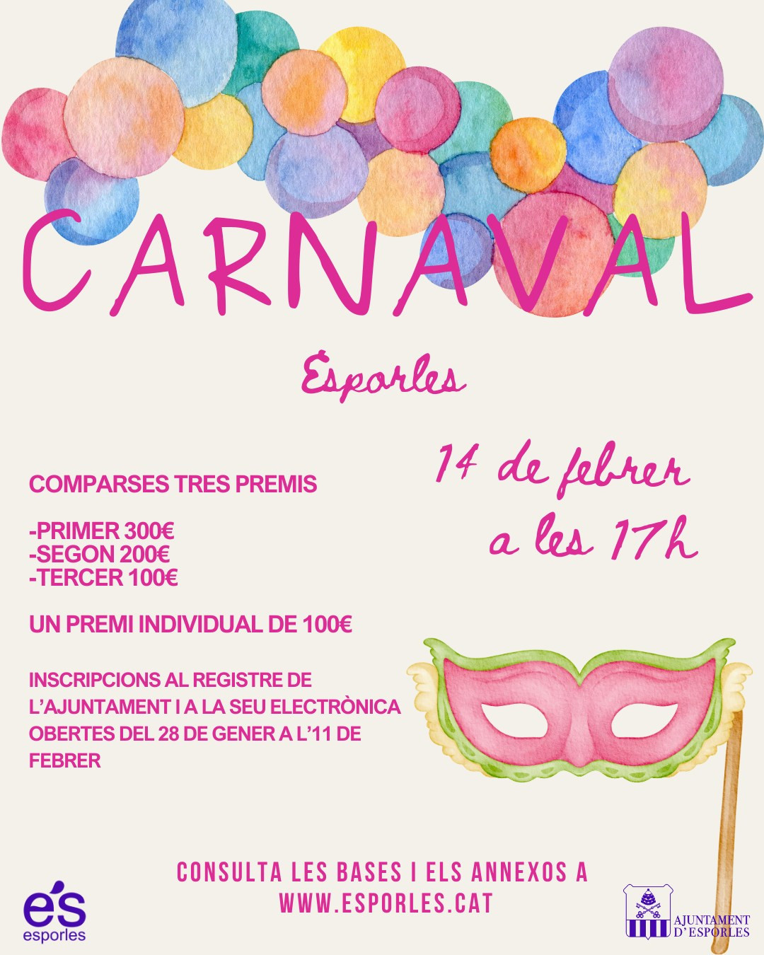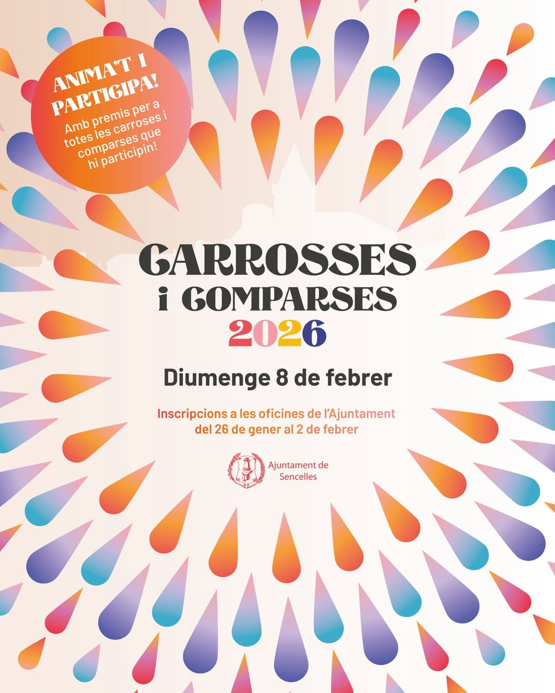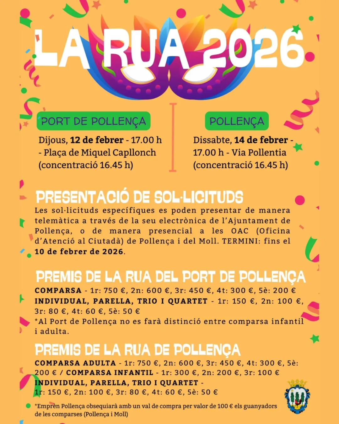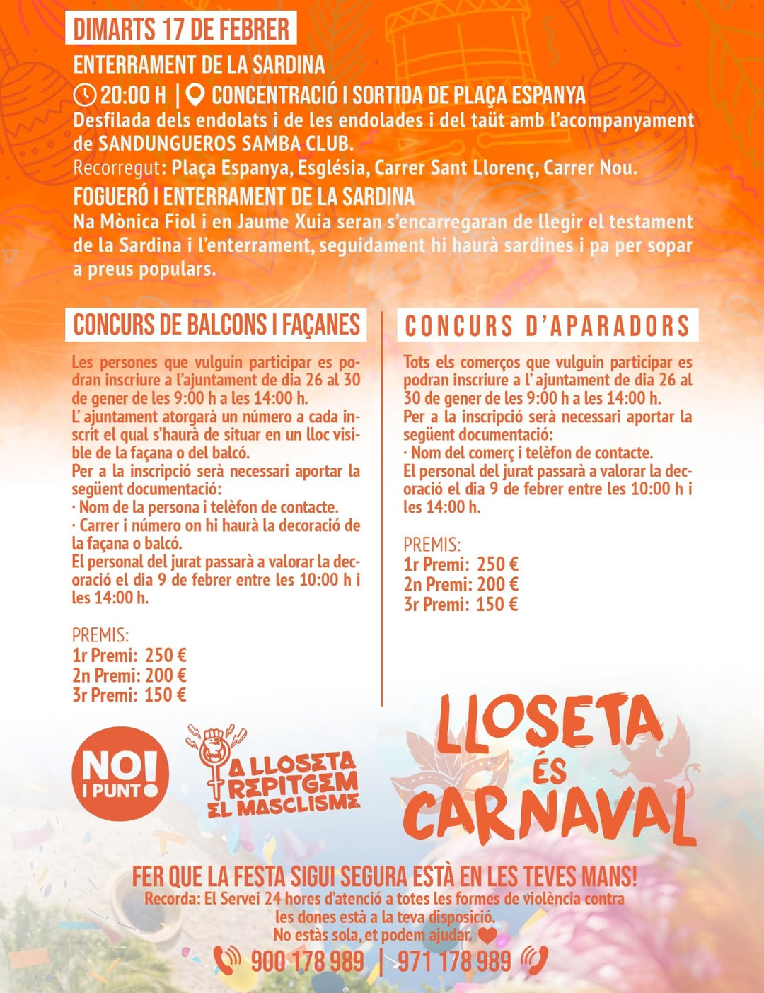 • Sun 8 Feb · concentration 15:30 · parade 16:00 · children’s entertainment + prizes (Plaça de ses Escoles Velles)