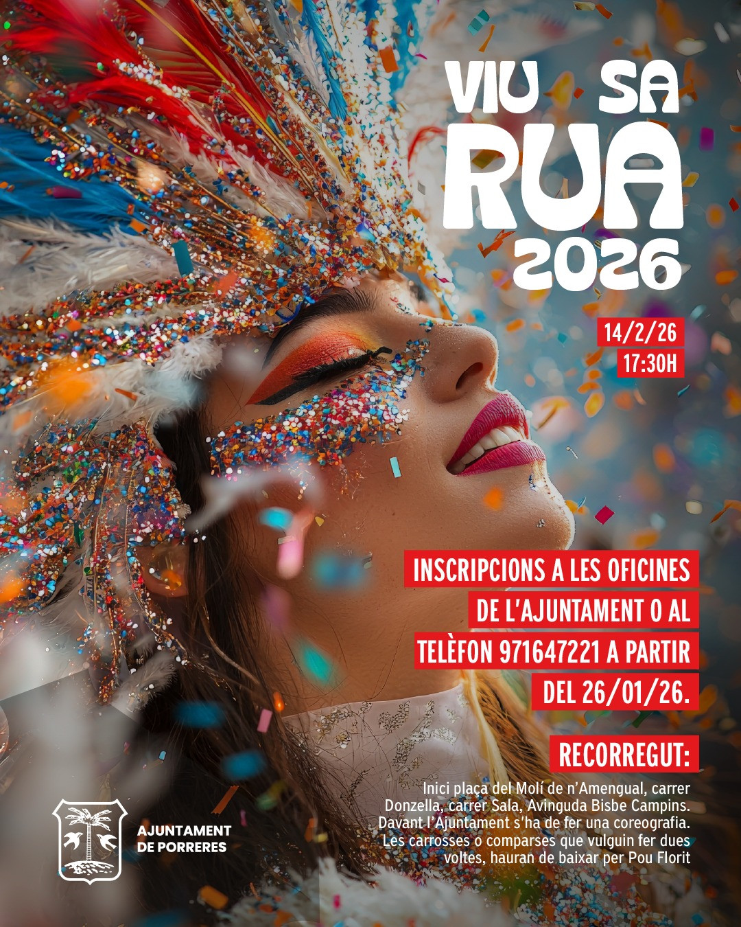 • RuaSat 14 Feb · 17:30 (route starts at Plaça del Molí de n’Amengual; choreography moment in front of the Town Hall)