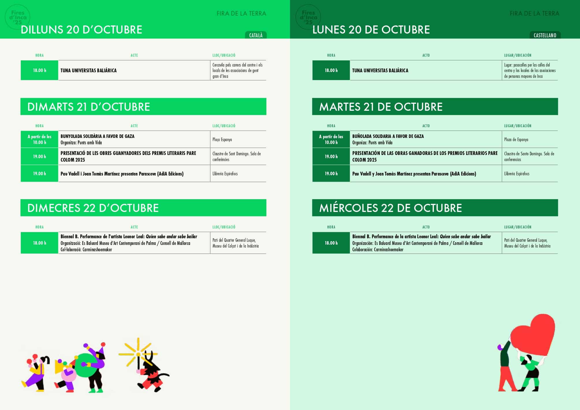 - 10:00–15:00 Recycling Fair (Covered Market) + kids eco-workshops, compost point, and C/ del Peix décor by Fundació Es Garrover.