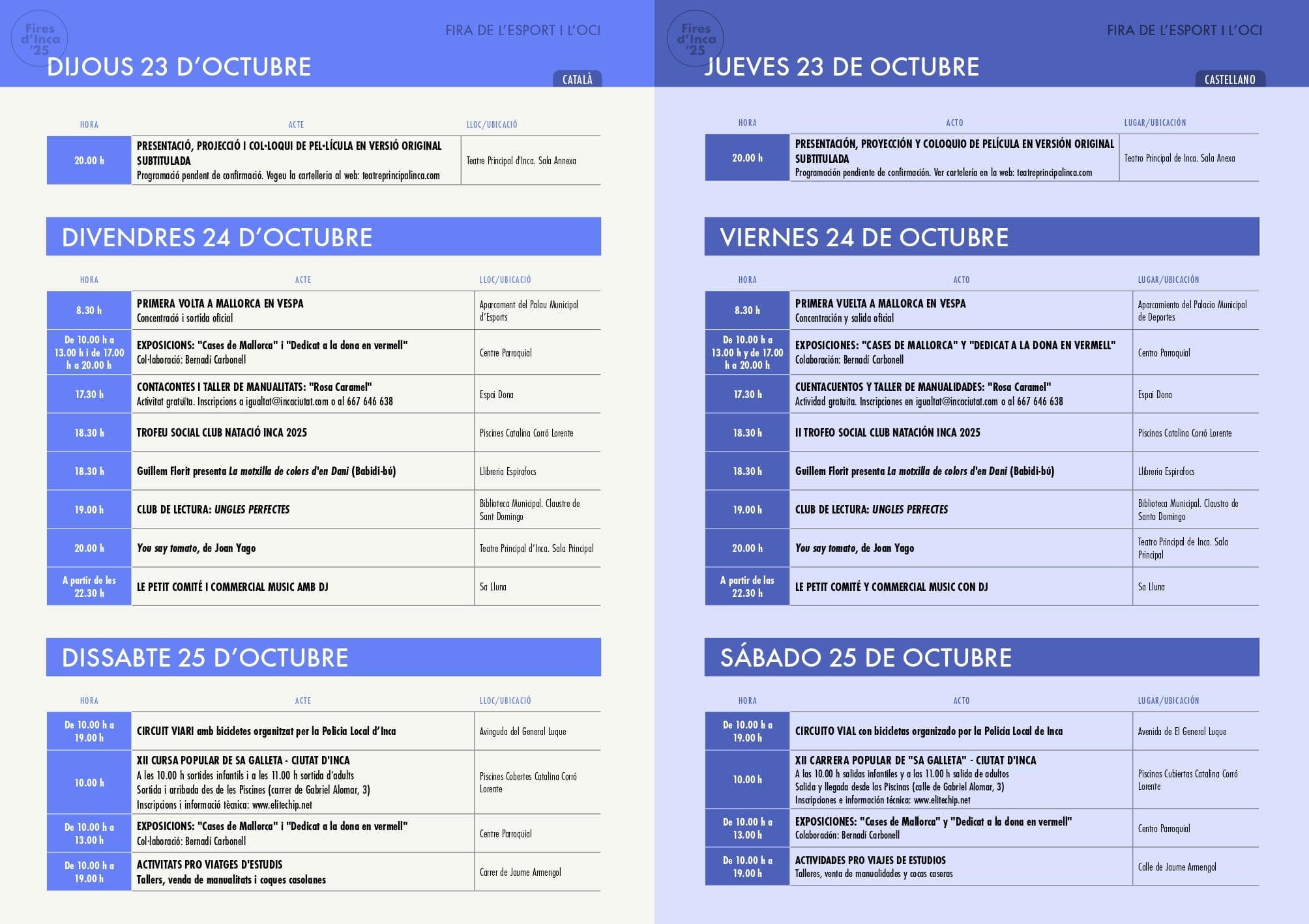 - Oct 16–26 Inca Fairs Padel Tournament – municipal courts (register at sportelia.com).