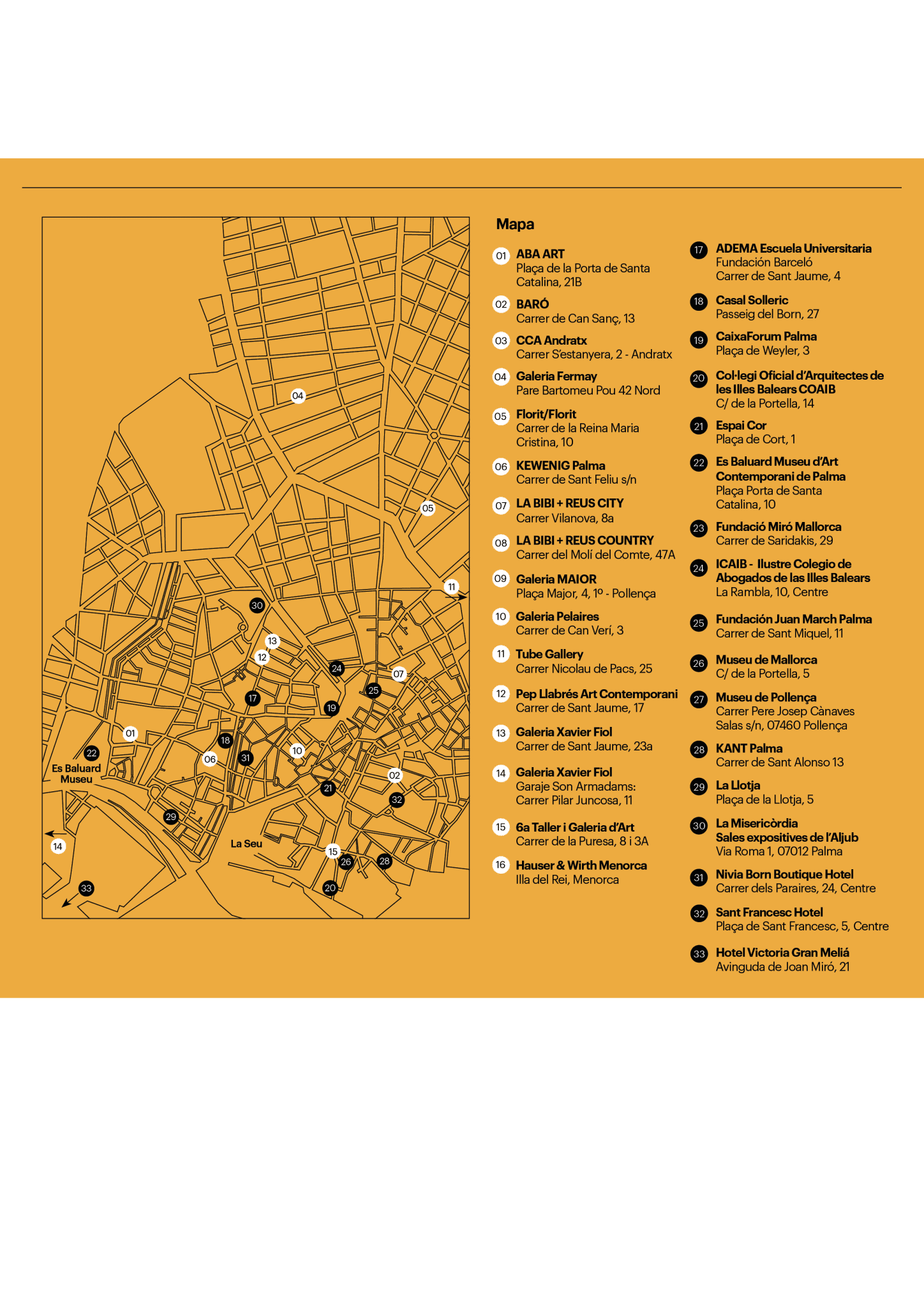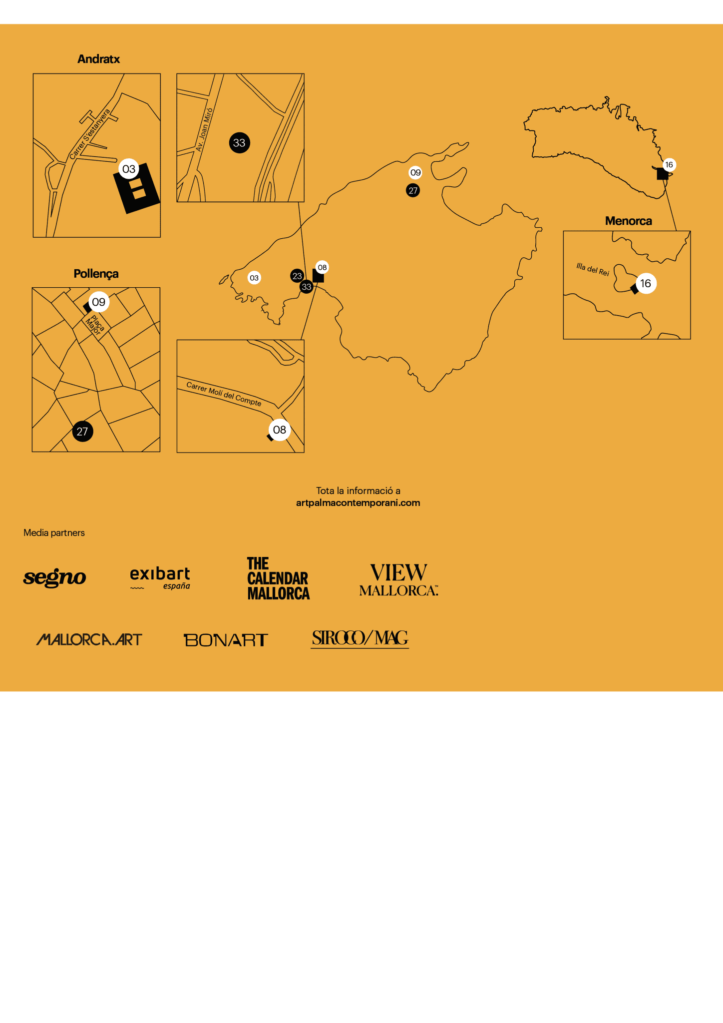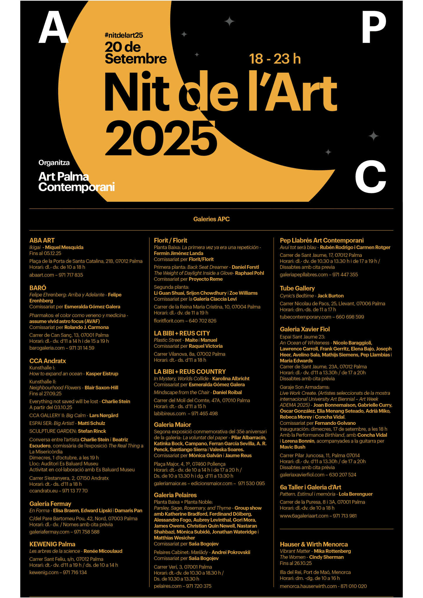 - 14 leading galleries of Art Palma Contemporani (including ABA ART, BARĂ, CCA Andratx, GalerĂa Fermay, Hauser & Wirth Menorca, KEWENIG, Pelaires, Xavier Fiol, and more).