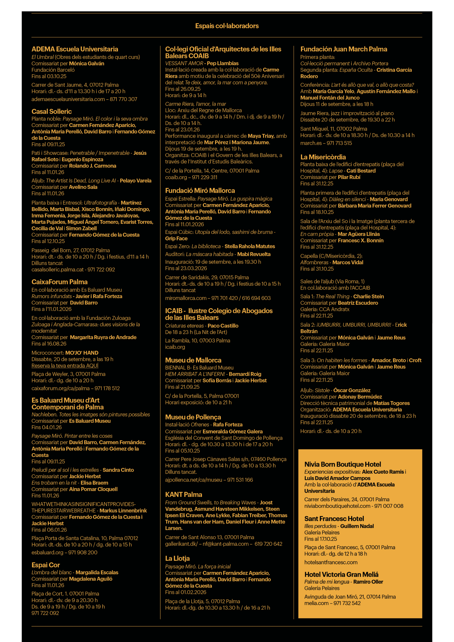 - La Misericòrdia: exhibitions by Cati Bestard, Maria Genovard, Mar Agßera, Marcos Vidal, ADEMA students, and CCA/Maior collaborations.