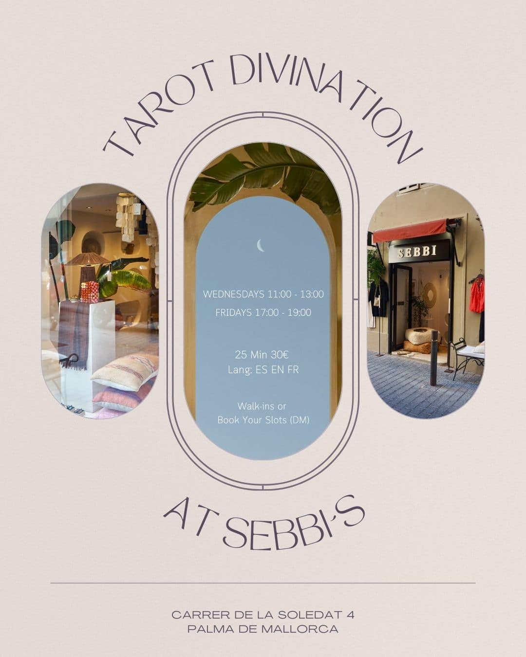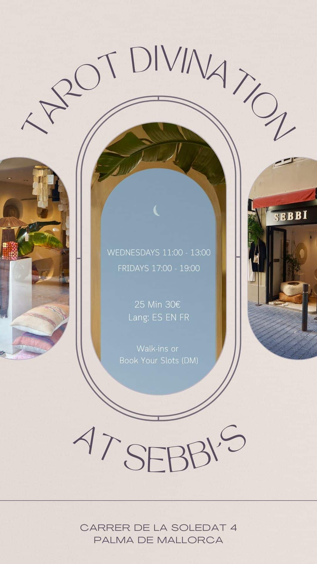 Located in the heart of Palma, SEBBIS is a carefully curated concept store where fashion, objects, and atmosphere come together with intention and style. Every week, the space opens up for a special moment of pause and reflection with Tarot Divination sessions, available twice weekly.